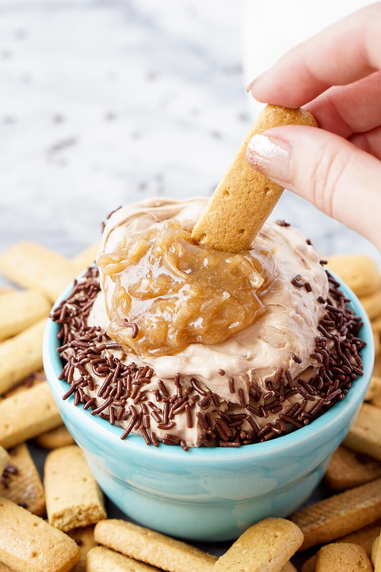 To whip up a batch of this indulgent dip, blend powdered cake mix with half a tub of pre-made frosting, then splash in the recipe’s star ingredient: pink champagne! (As an added bonus, you can drink the rest.) In minutes, you have a fluffy, festive dessert that’s totally portable and fun to share with your family and friends!