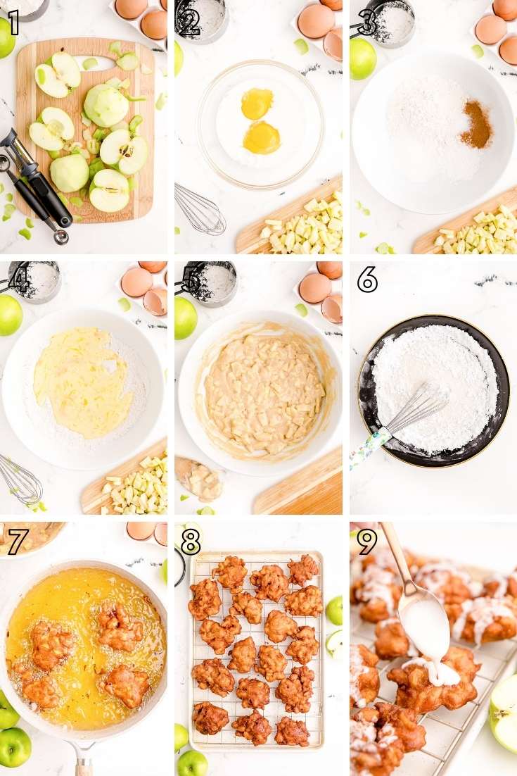 After the Apple Fritters are deep-fried in canola or vegetable oil they get a drizzle of sweet vanilla glaze to finish them off! This is made by combining powdered sugar, vanilla extract, and whole milk.