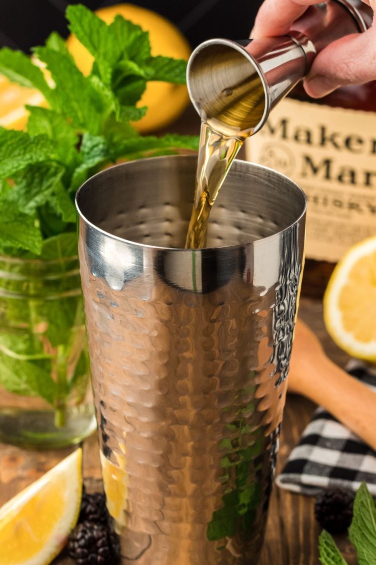 - Add in 1 ounce blackberry simple syrup and 2 ounces bourbon whiskey.