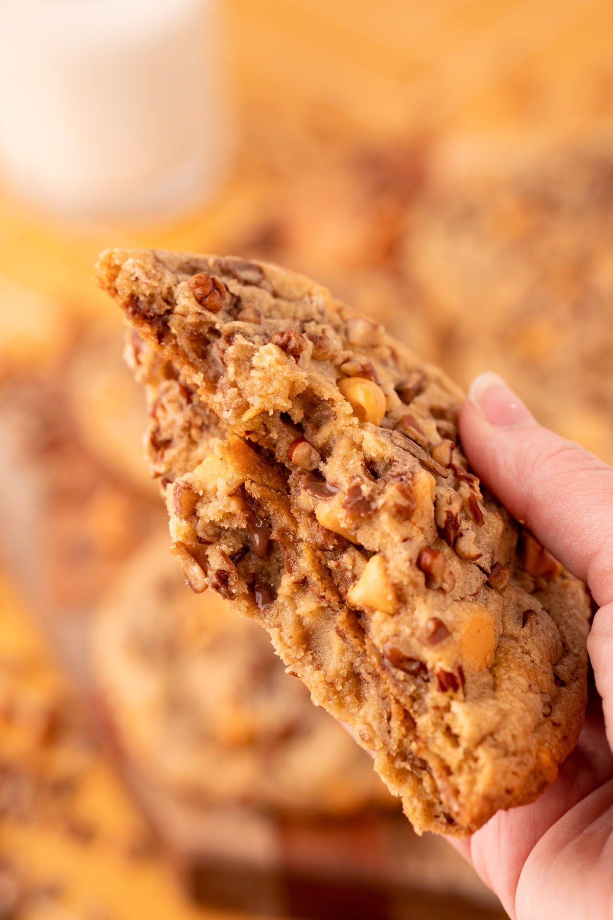 Butter Pecan Cookies are large, bakery-style cookies that are easy to make and are loaded with chopped pecans, toffee bits, and butterscotch chips! No chilling is required, and they’re ready in under 30 minutes!