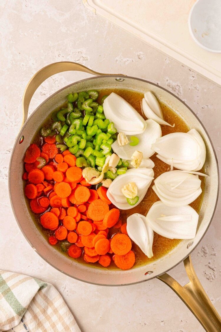- Meanwhile, peel and dice 2 carrots, dice 2 stalks celery, peel and quarter 1 white onion, and peel and smash 3 garlic cloves. Set aside in a bowl.