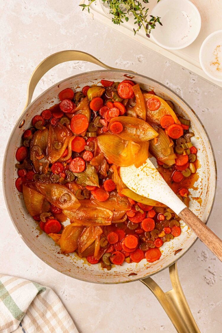 - Stir in sprigs of fresh thyme, a bay leaf, paprika, turmeric, and chicken broth. Then continue to cook until the vegetables are soft, and most of the liquid has evaporated.