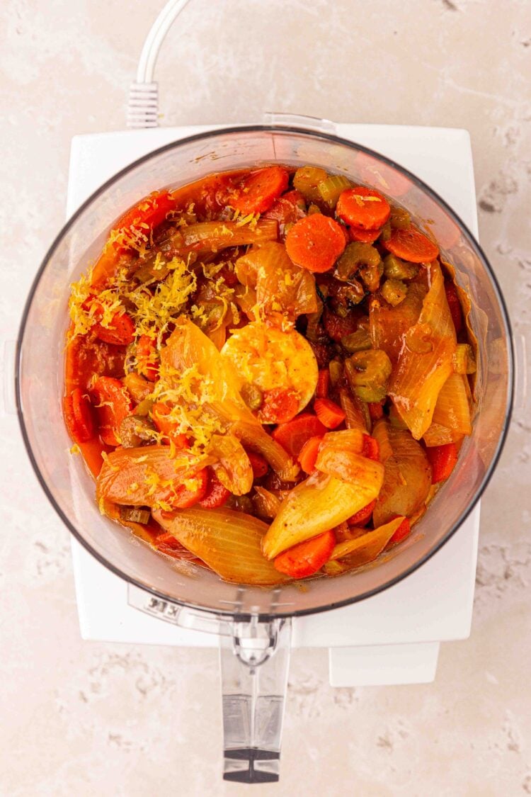 - Transfer the cooked veggies to a food processor or blender. Then add in lemon juice and lemon zest. Pulse the food processor or blender until the mixture becomes mostly smooth.