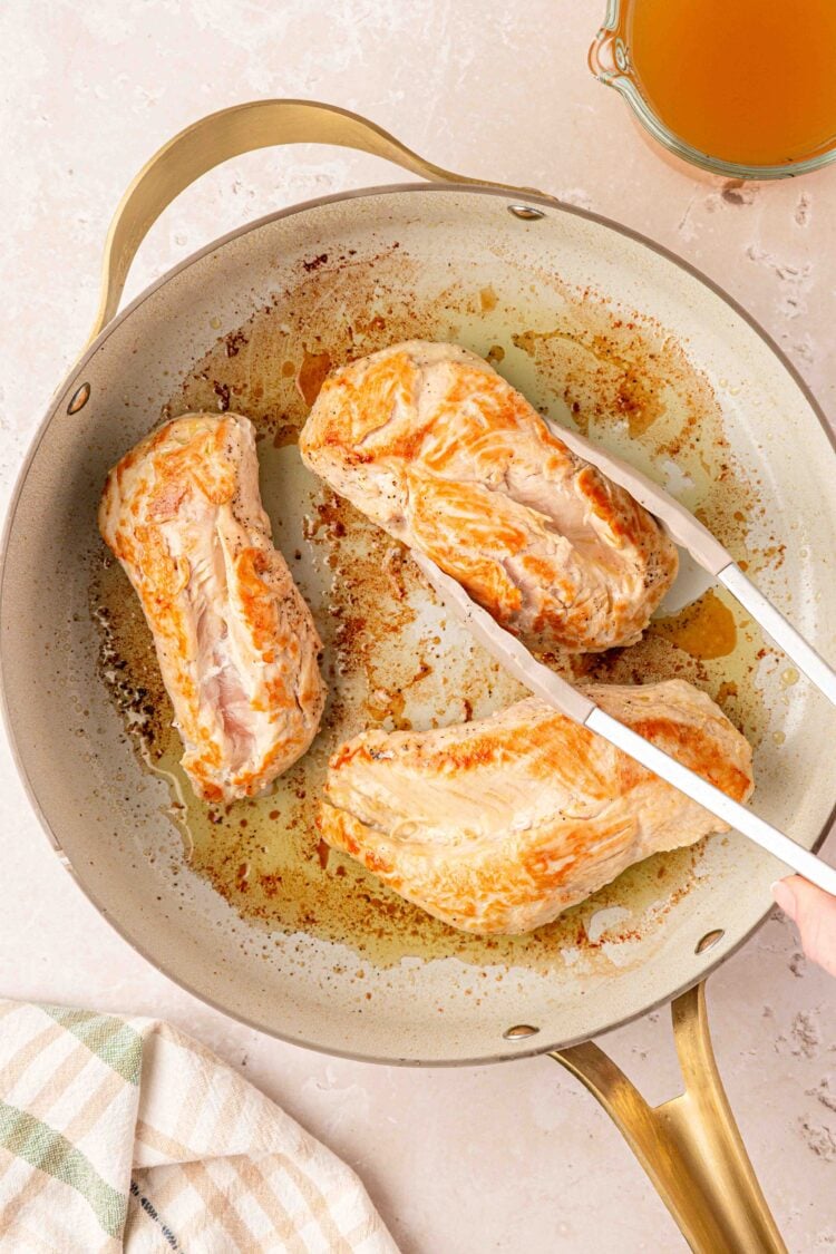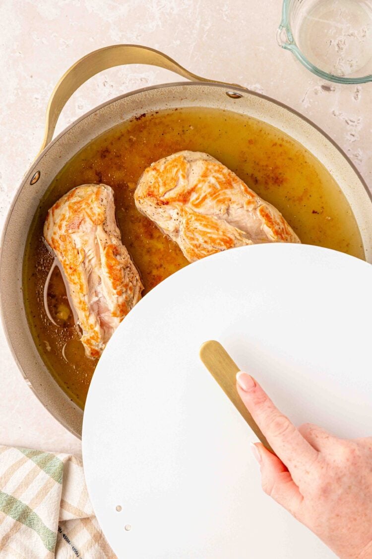 - Pour chicken broth into the pan and then cover it with a lid and continue to cook the chicken until done.