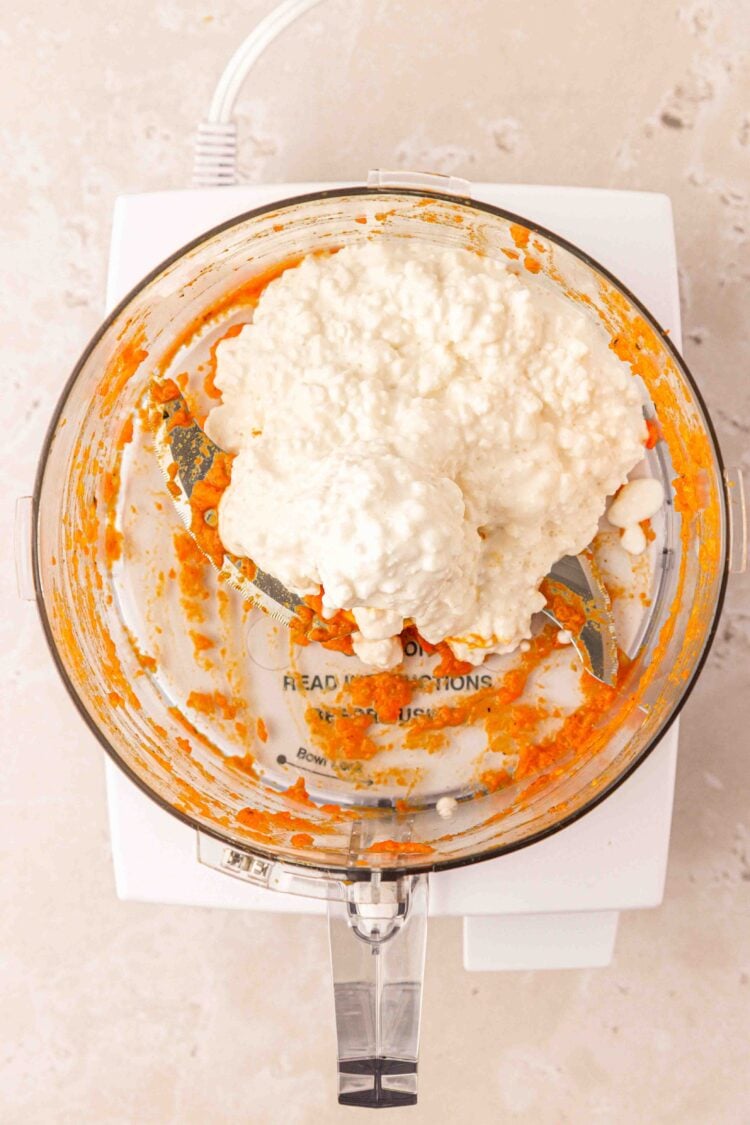 - Add the processed vegetable mixture to the cooled shredded chicken, then add ¾ cup cottage cheese to the food processor and pulse until mostly smooth.
