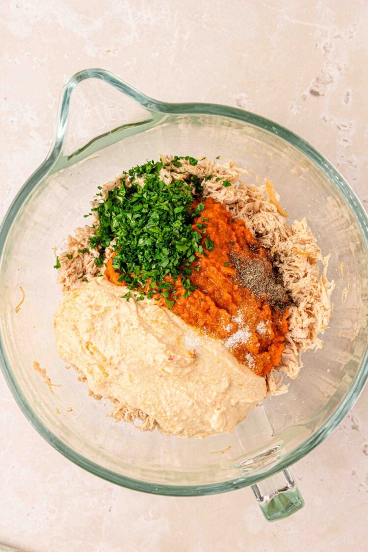 - Add the blended cottage cheese to the bowl with the chicken, along with 1 tablespoon fresh parsley, ¾ teaspoon fine sea salt, and ¼ teaspoon ground black pepper, and mix until thoroughly combined. Add additional salt and pepper or other seasoning, such as 1 tablespoon nutritional yeast, to taste.