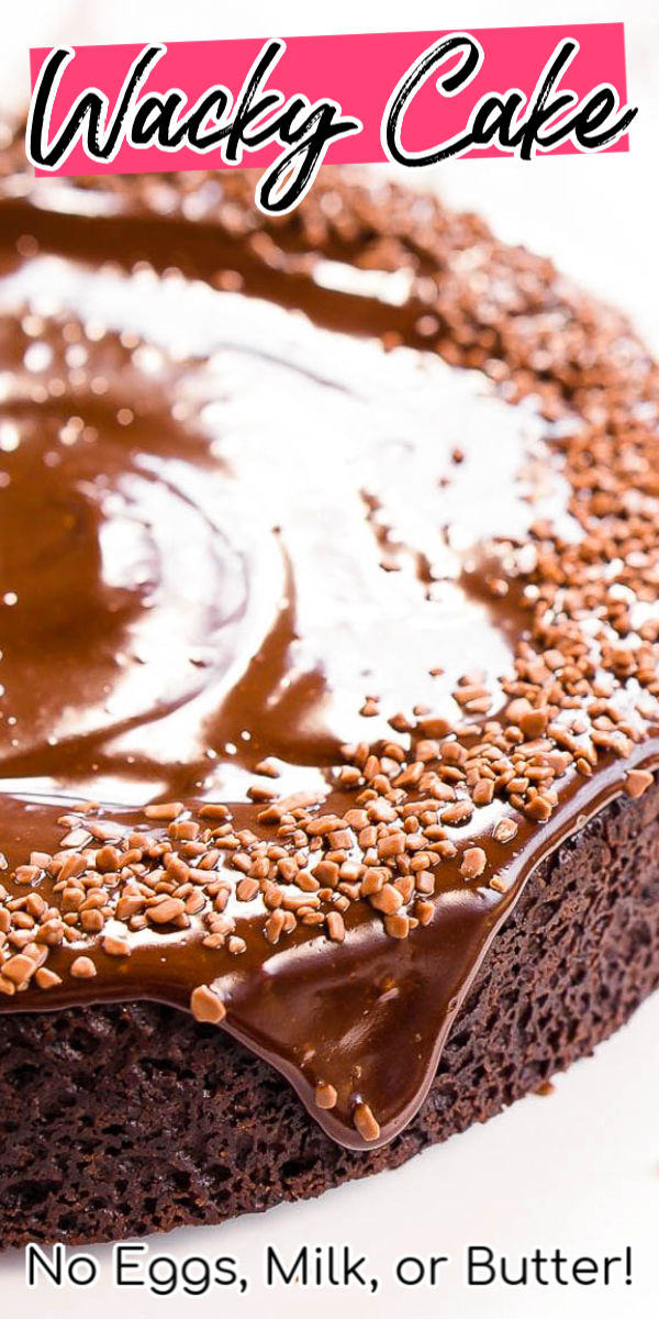 This Chocolate Wacky Cake is a delicious old-fashioned one-pan chocolate cake that contains no eggs, butter, or milk and is made completely with pantry staples! It’s totally wacky and vegan too!