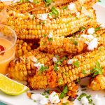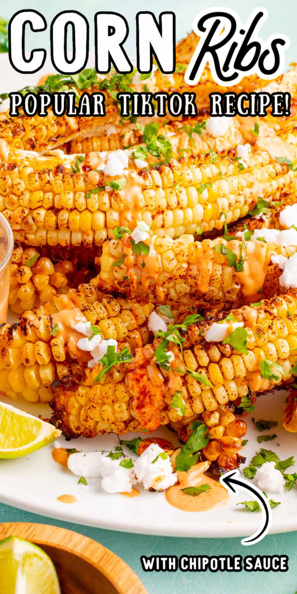 Serve these Corn Ribs up with the spicy chipotle sauce, cilantro, jalapenos, and crumbly cheese for a side dish you’ll turn to again and again! And with no complaints from anyone since it’s so tasty!