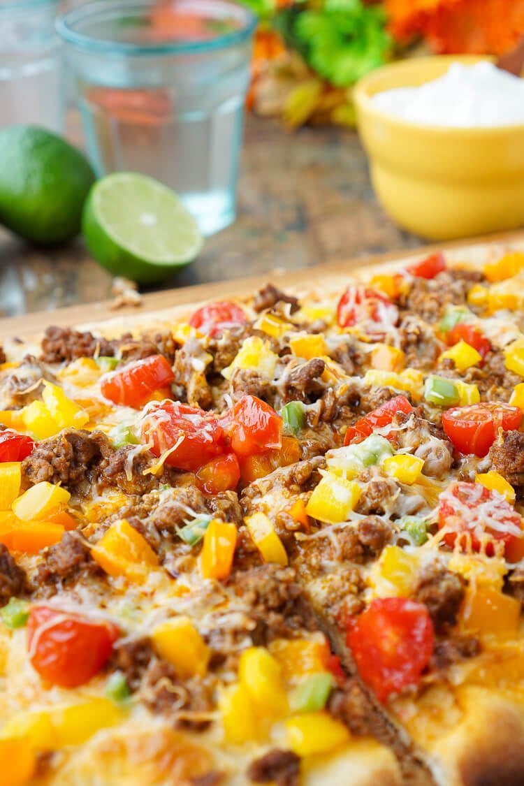 - Sprinkle the taco meat with 1 cup of the shredded cheese. Evenly distribute peppers and tomatoes on the cheese and cover with the remaining cup of cheese.