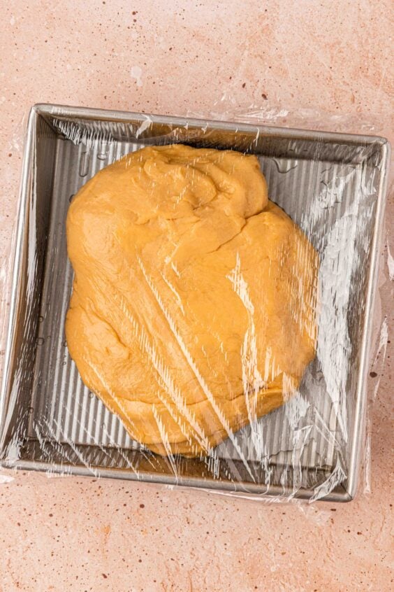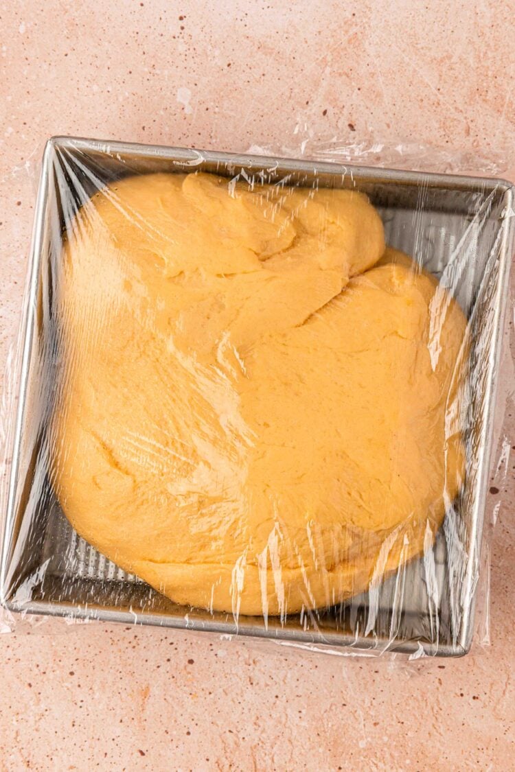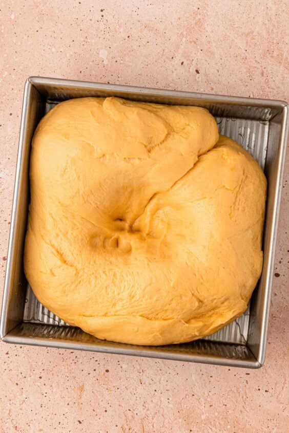 - Brush 1 tablespoon vegetable or canola oil on a 9×9-inch pan and turn your dough out into it (you can spray with a nonstick spray instead). Rotate the dough so it’s oiled on all sides, then cover it with cling wrap and let it rise somewhere warm. It should double in size within 45 to 60 minutes in a warm home or 75 to 90 minutes in air conditioning. Note that the dough will expand outward in the pan, rather than upward, much like it would in a bowl; however, it should fill the pan and rise above it slightly when ready. Using a pan helps it form a square shape, which makes it easier to roll.