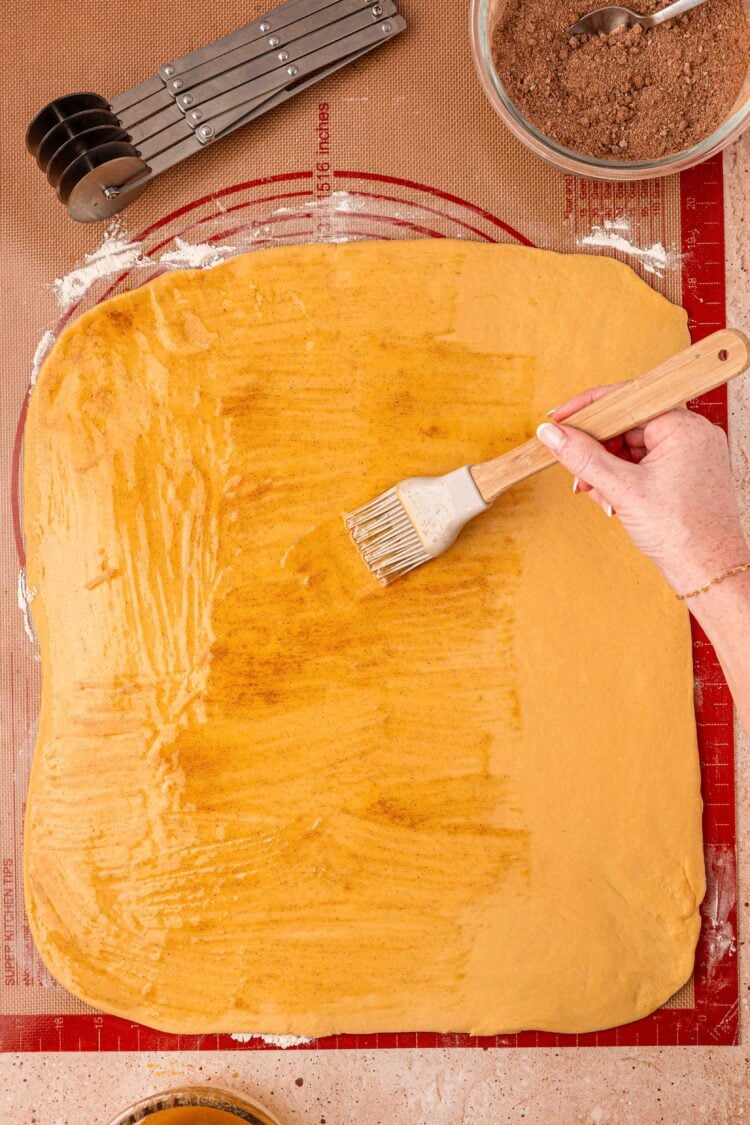 - Prepare the filling by combining melted butter with vanilla bean paste, then brush the mixture all over the surface of the rolled-out dough.
