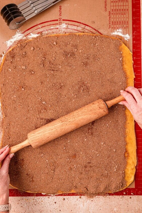 - Sprinkle the cinnamon sugar mixture over the dough that’s been brushed with butter. Using a rolling pin, roll the cinnamon sugar filling over to press it into the dough.