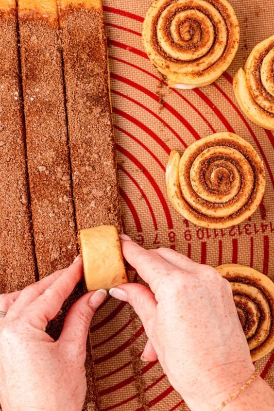 - Cutting The Dough – I prefer using a pastry mat to roll out the cinnamon roll dough; its nonstick surface makes it much easier to work with. I then use a pastry wheel cutter for clean cuts; however, a pizza wheel cutter would also work.