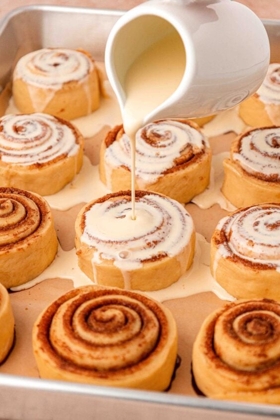 - Transfer the rolls onto the parchment-lined baking sheet and then pour eggnog over the top of the cinnamon rolls. (Or skip this step if you prefer!) Then cover the rolls and allow them to rise while the oven preheats.