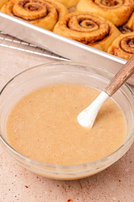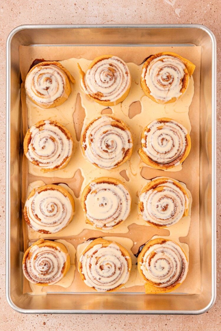- Use a rubber spatula or spoon to spread the icing over the top of the warm rolls. This is a lot of icing, but it should absorb into the swirls of the rolls, making them extra gooey.