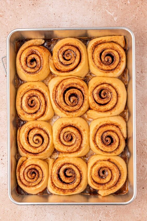 - Avoid Over Proofing – It’s important to keep a close eye on these rolls during the proofing process and baking. If they become over-proofed, the rolls can puff up so much that they squeeze some of the cream/butter out over the rim of the baking pan. To help avoid this, be sure to preheat the oven while the rolls are on their second rise.