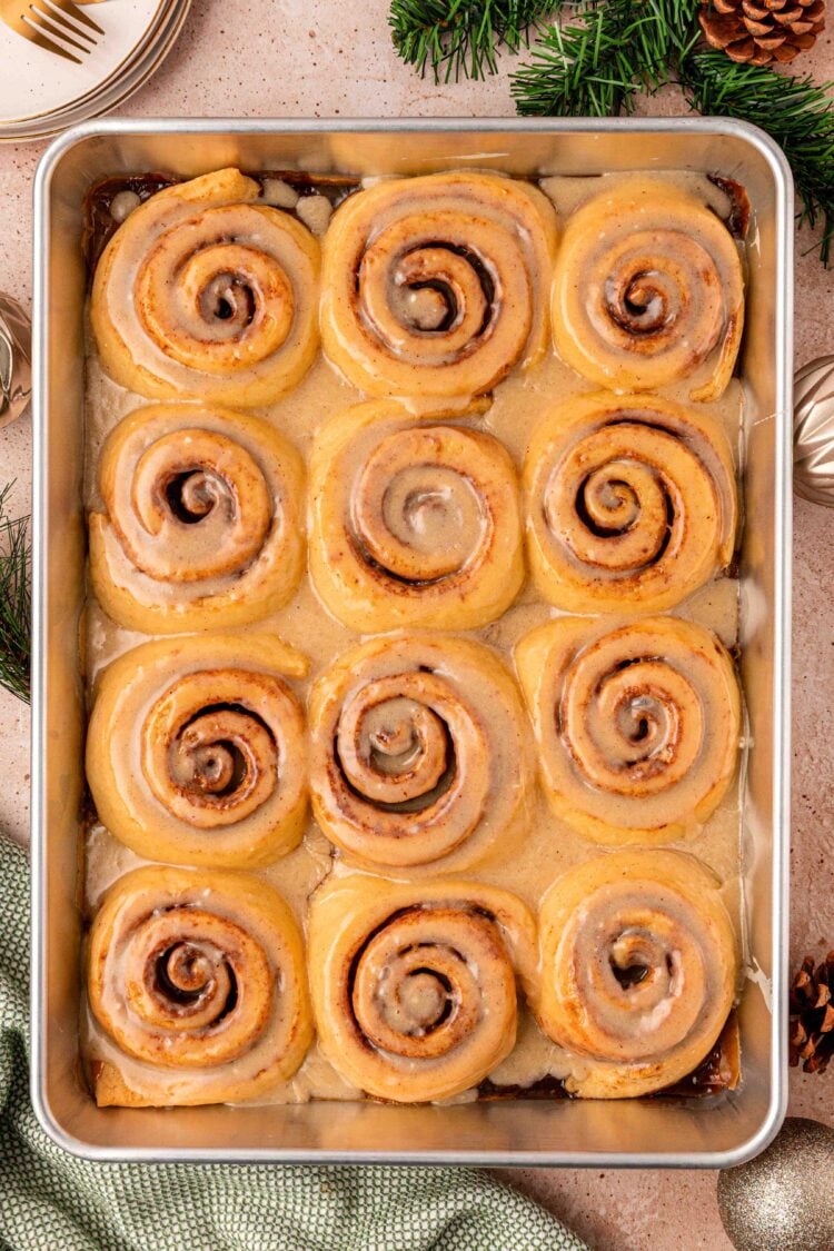 - Pour ¾ cup eggnog over the top of the cinnamon rolls right before covering for their second rise, about 1 tablespoon over each roll. (You can skip this step if desired and carry on with the recipe with no additional changes).