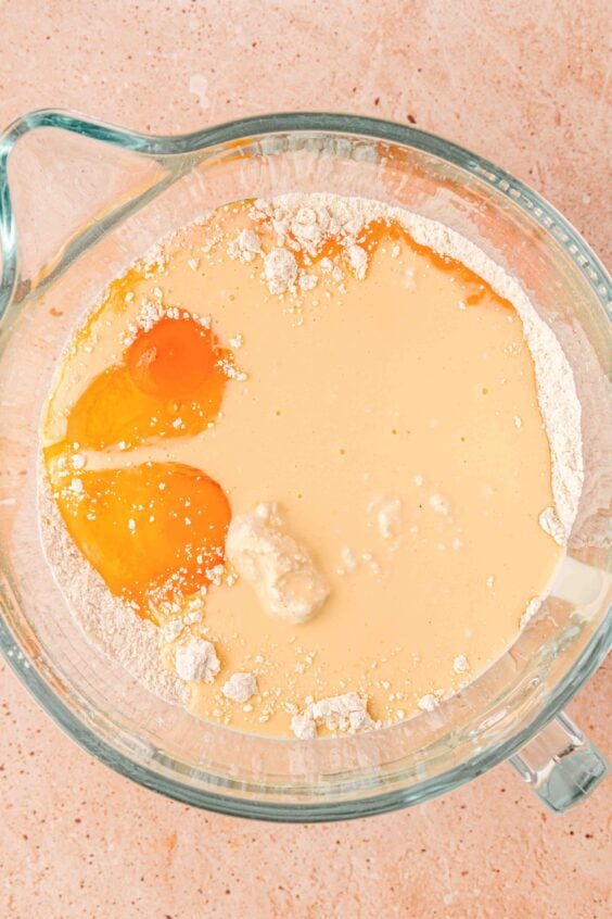 - Add in 1¾ cups eggnog, 2 large eggs, and 2 additional large egg yolks and mix for 15 seconds.