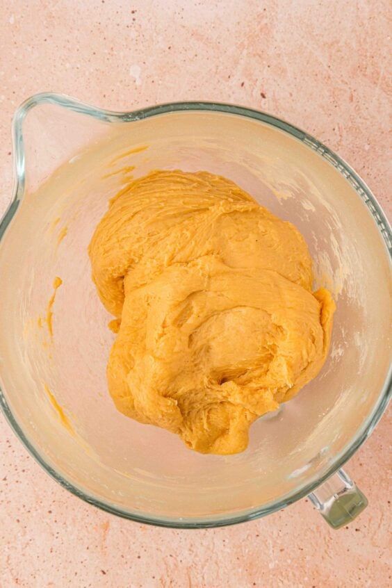 - Add in the eggnog, large eggs, and additional large egg yolks. Then mix the cinnamon roll dough together using a stand mixer fitted with a dough hook attachment.