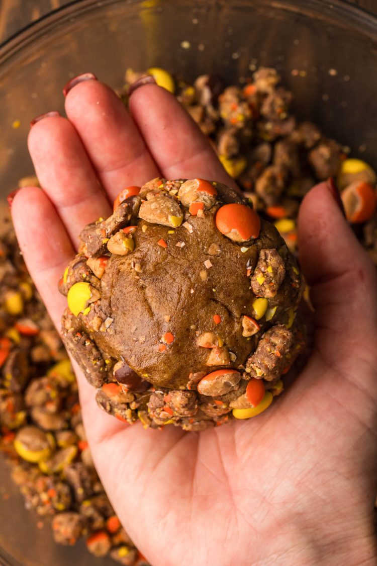 - Add 1 (9.9oz) bag Reese's piecesto a food processor and pulse for about 15 to 20 seconds; this helps crush the pieces a bit to give them the signature look of these cookies. You can leave them whole, but they can have a hard time sticking to the outside of the dough, so press them in well.
