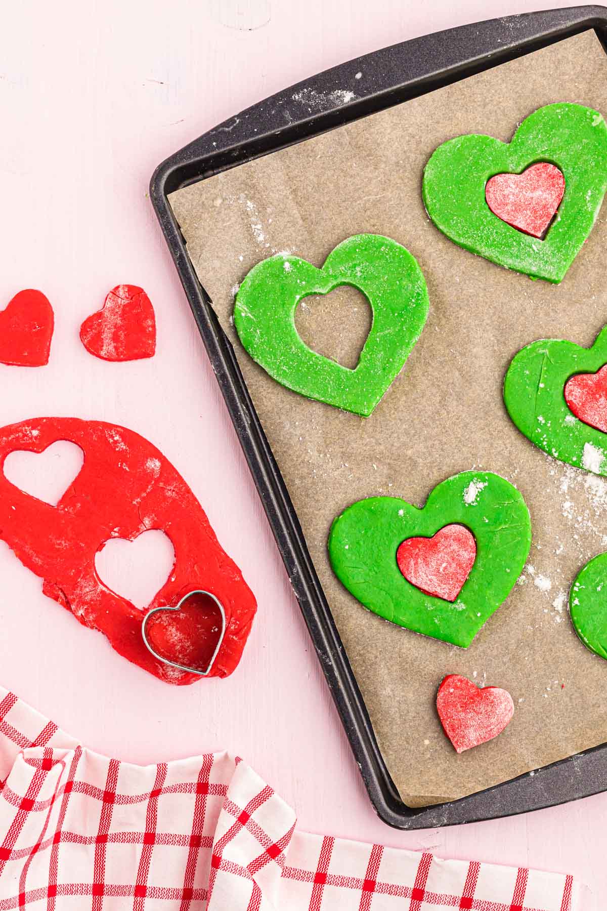 - Remove the green dough once it has been chilled. On a lightly floured surface, roll the dough to be about ¼-inch in thickness. Cut the dough using a large heart-shaped cutter and place the cutouts on a parchment paper-lined cookie sheet. Once done, use the small heart-shaped cutter and cut out the center of each green cookie, and set the cutout aside.
