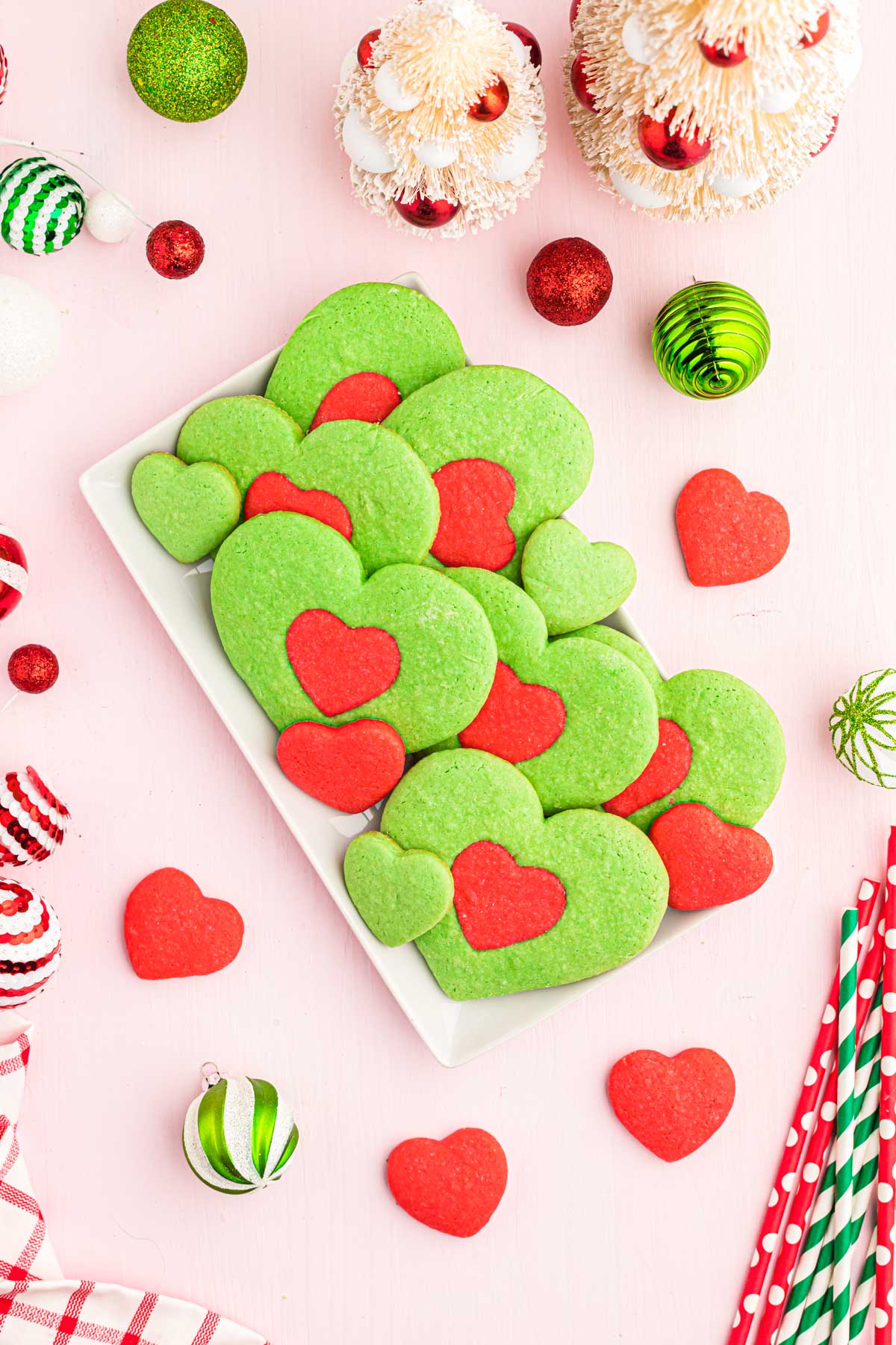 These Heart-Shaped Grinch Cookies were inspired by the most recent adaptation of How The Grinch Stole Christmas! Made with a basic sugar cookie dough and colored red and green to create the cutest cookies of the season!