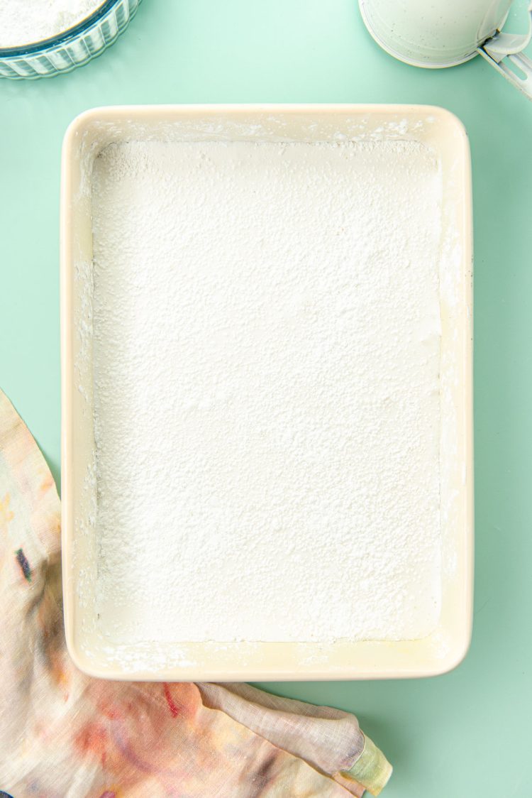 - Lightly spray a 9×13-inch baking pan with cooking spray and dust with the powdered sugar mixture. Dump the excess back into the bowl with the rest of the mix.