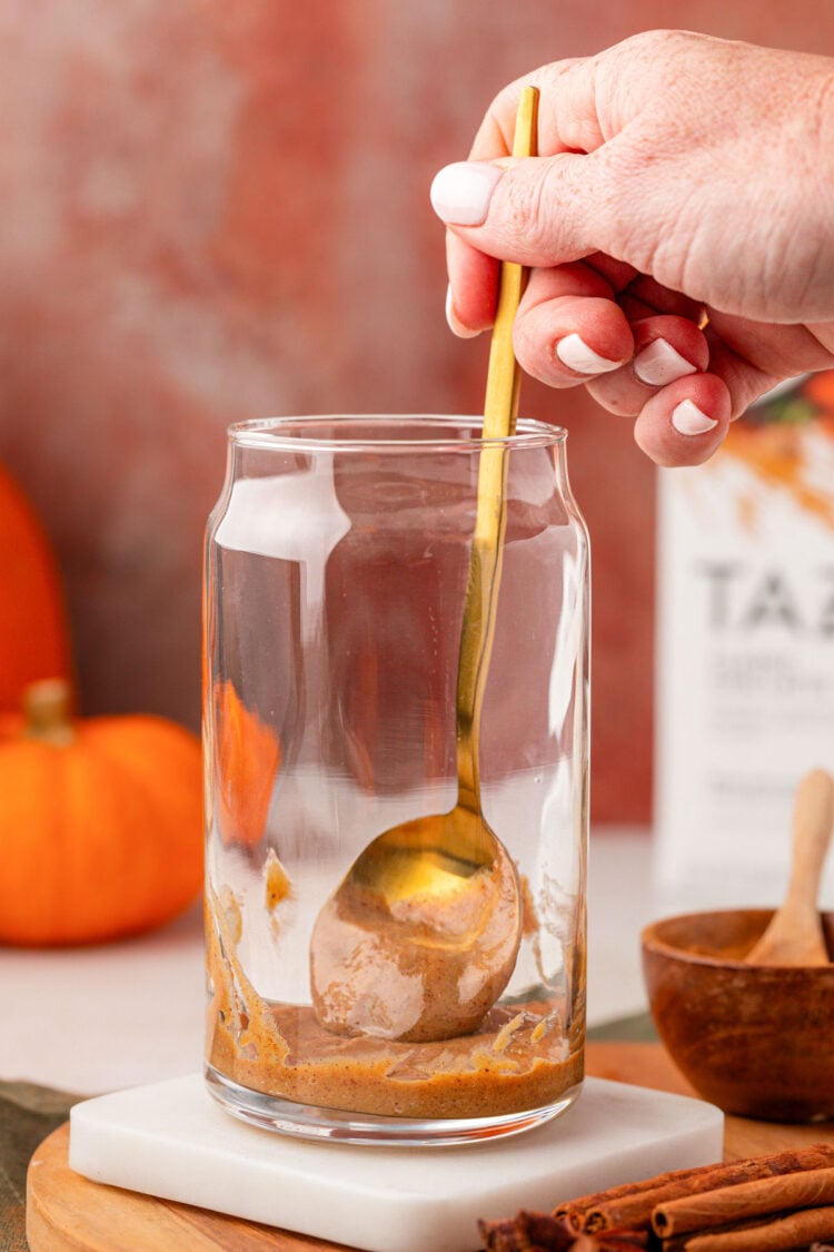 - Add 2 tablespoons pumpkin spice sauce and 4 ounces chai concentrate to a 14 to 16-ounce glass and mix well with a spoon or hand frother.