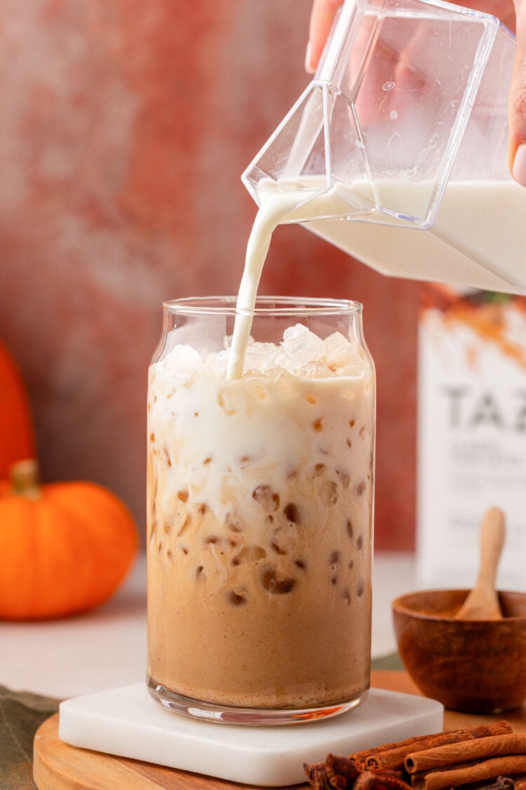 If you’d rather warm up than cool down, you can turn this recipe into a Hot Pumpkin Chai Latte! To do so, simply warm up the tea concentrate and steam the milk to 160 degrees F.