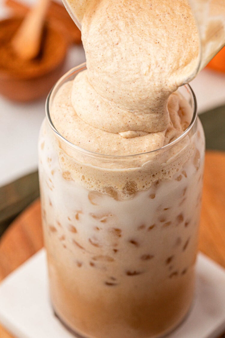 - Prepare a batch of pumpkin cold foam and then add it to the top of the drink.