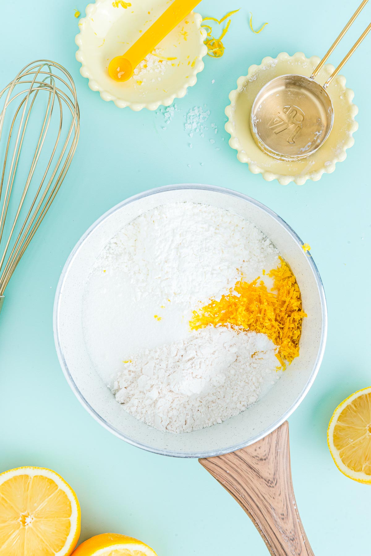7. Whisk together granulated white sugar, cornstarch, flour, lemon zest, and sea salt in a saucepan. Next, add in the whole milk and lemon juice, again whisking the mixture.
