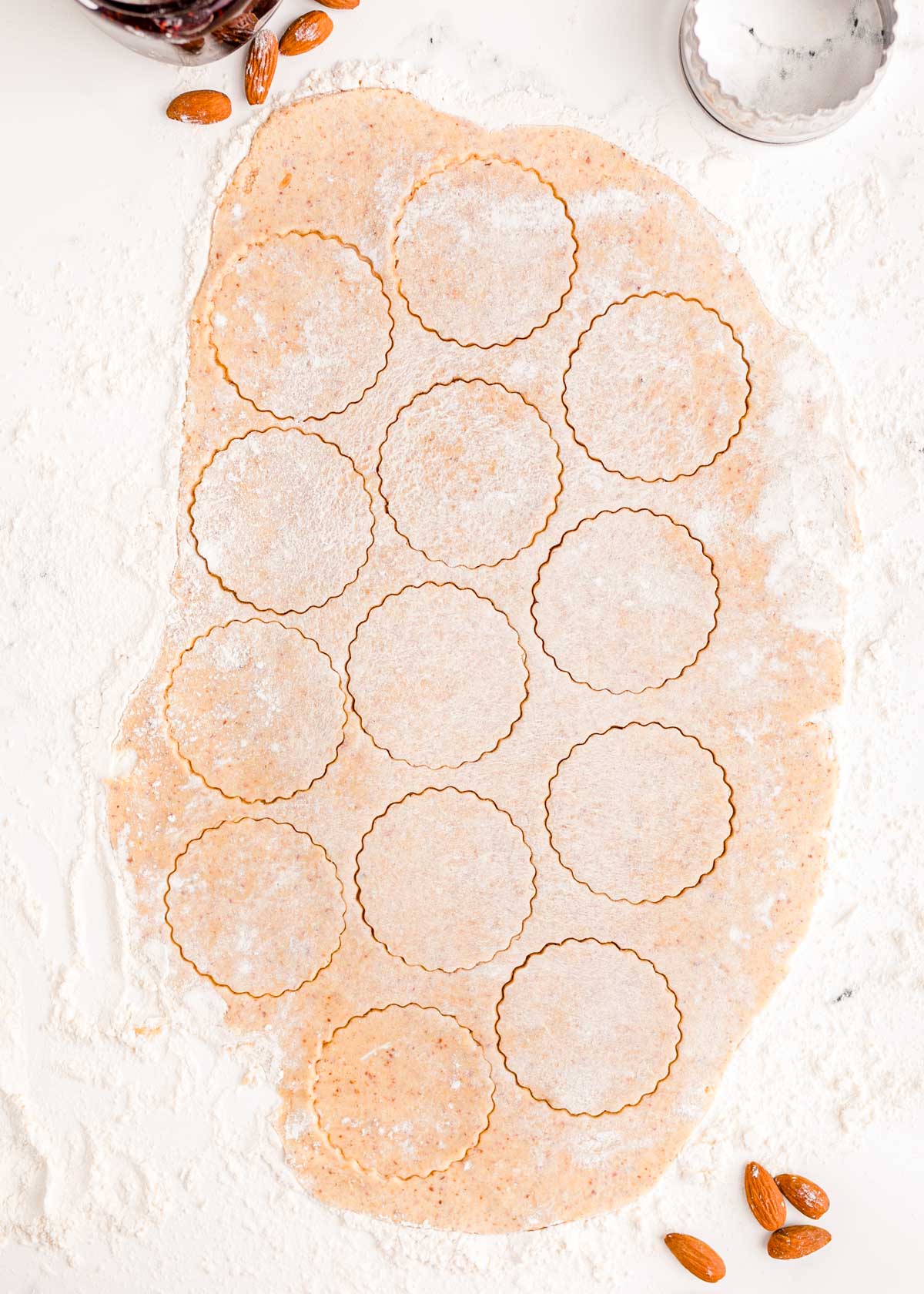 - Use a 2½-inch round cookie cutter to cut out as many cookies from this dough as you are able to. Use a smaller cookie cutter to cut out a shape from the middle of half of the cookies, like a little window. Combine the scraps into a disc then roll the dough out again to make more cookies.