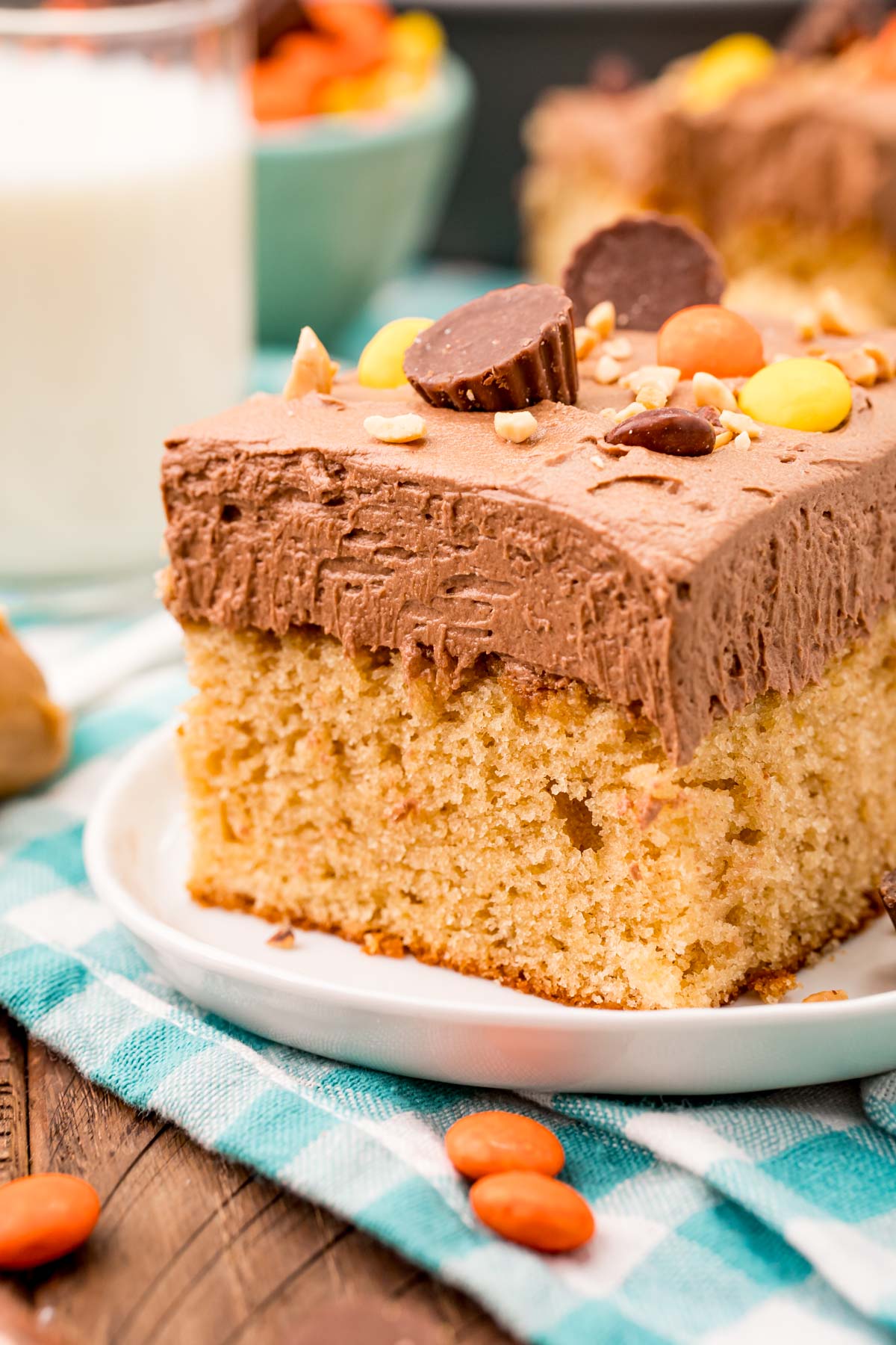 It’s perfectly tender, is the best balance of sweet and salty, and can come loaded with fun peanut butter candy on top! Grab those easy baking ingredients off the recipe list to get this cake prepped for the oven in just 15 minutes and you’ll be well on your way to enjoying your first slice!