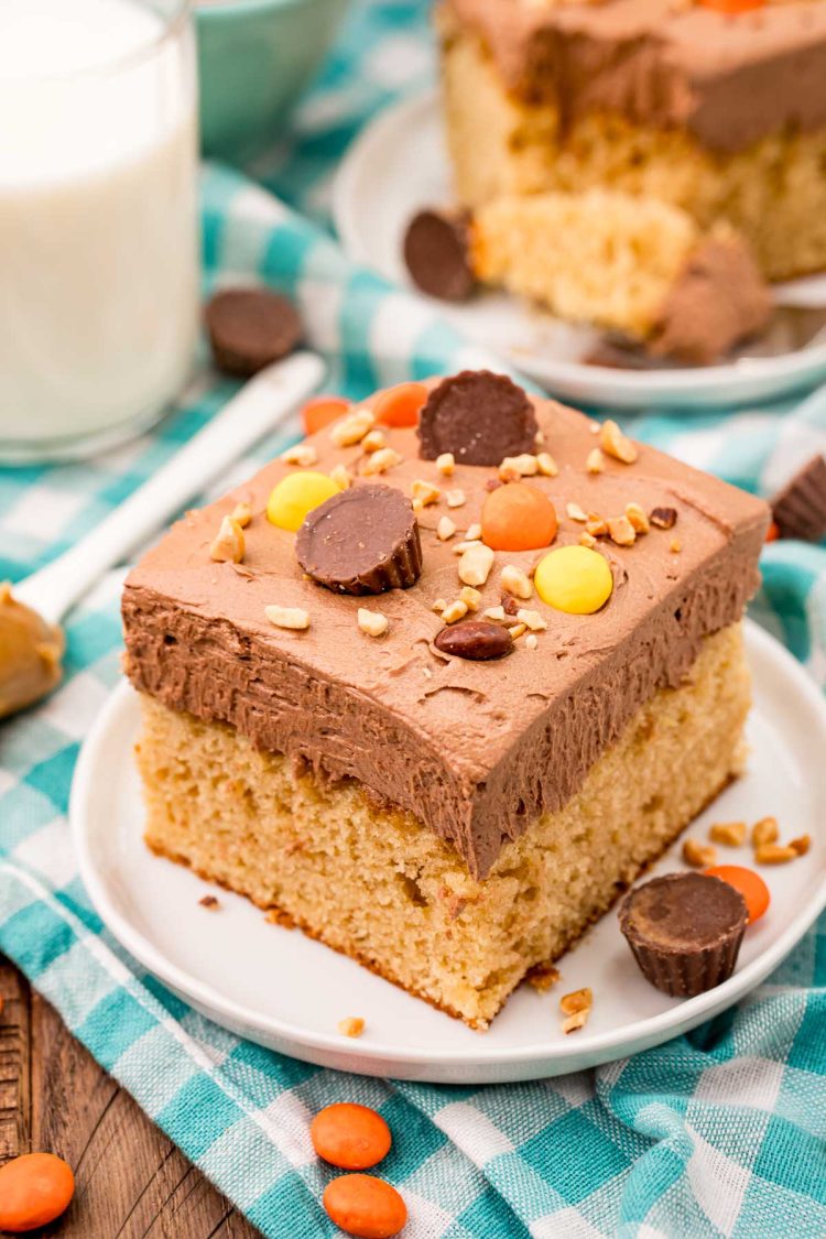 It’s perfectly tender, is the best balance of sweet and salty, and can come loaded with fun peanut butter candy on top! Grab those easy baking ingredients off the recipe list to get this cake prepped for the oven in just 15 minutes and you’ll be well on your way to enjoying your first slice!
