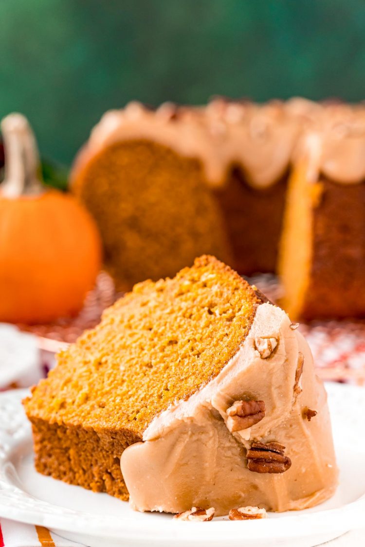 This is a delicious, moist pumpkin pound cake with a balanced spice blend that doesn’t overwhelm. And the caramel frosting is a perfect complement, garnished with toasted pecans.