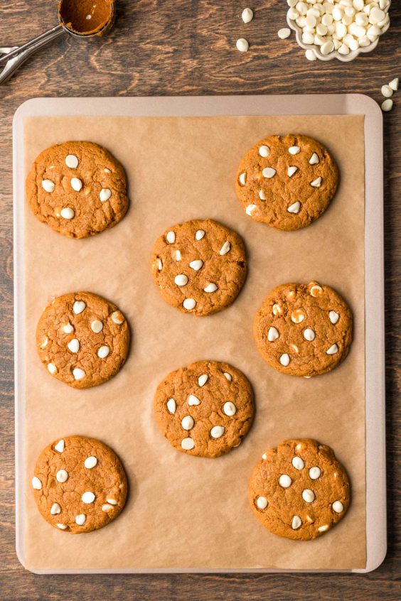 - Adding Additional White Chocolate Chips – Partway through baking, the sheet of cookies is removed to add additional white chocolate chips on top. This is an optional step, but it does prevent the top chips from browning while still allowing them to melt into and bind with the dough while baking. This will deliver pumpkin cookies with beautiful white chips on top!