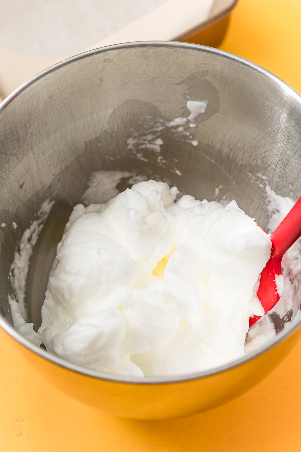 Next, beat your eggs whites in a stand mixer or large bowl until stiff peaks form.