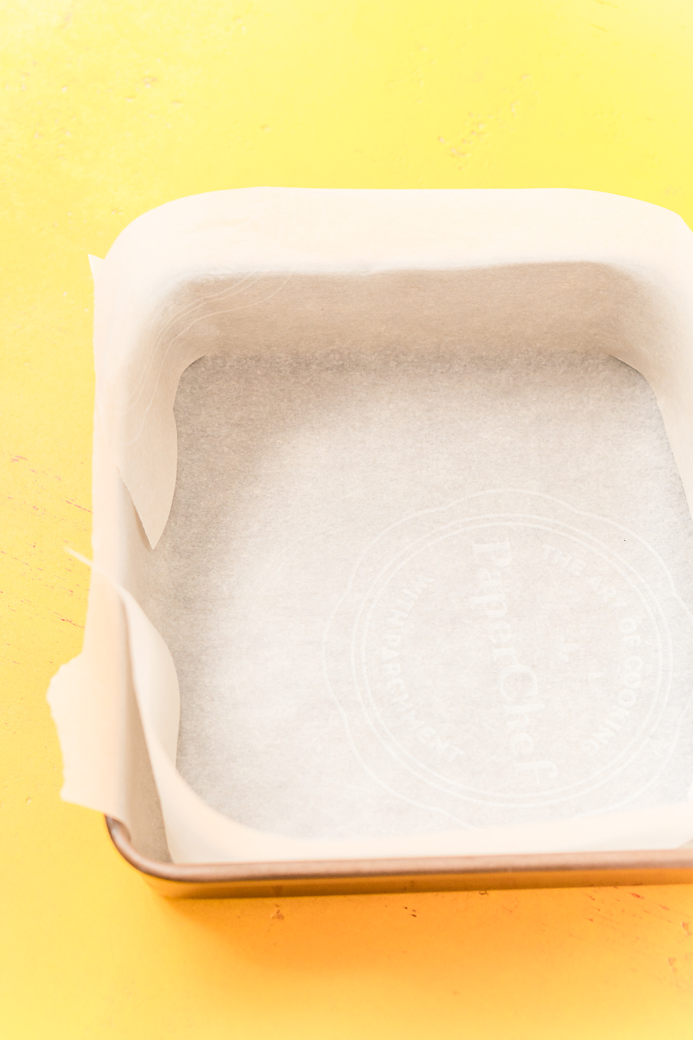 - Preheat oven to 325 degrees F and line an 8x8-inch pan with parchment paper and set aside.