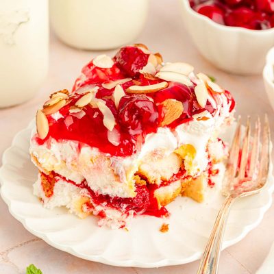 Texture: Heaven On Earth Cake is filled with lots of delicious textures! From the light, moist angel food cake to the sticky strawberry pie filling that’s topped off with the creamy vanilla pudding topping. Finishing off this no-bake dessert is fluffy cool whip sprinkled with crunchy slivered almonds and the remaining gooey pie filling!