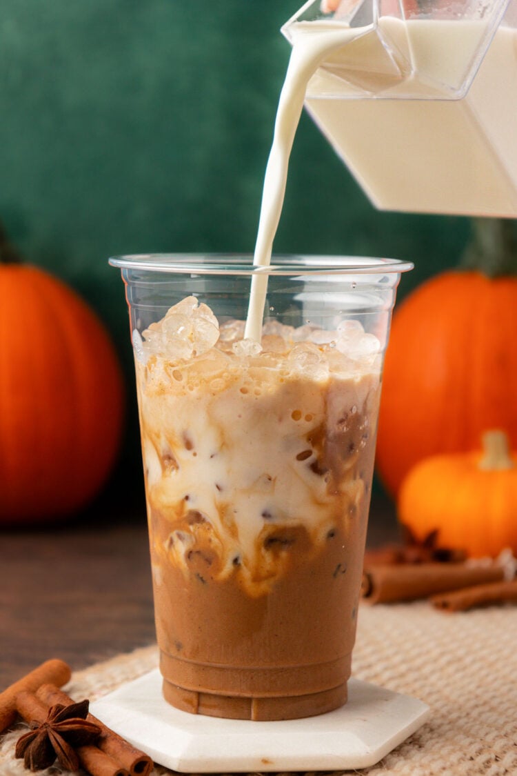 - Pour the pumpkin espresso mixture over ice and then top it with milk.