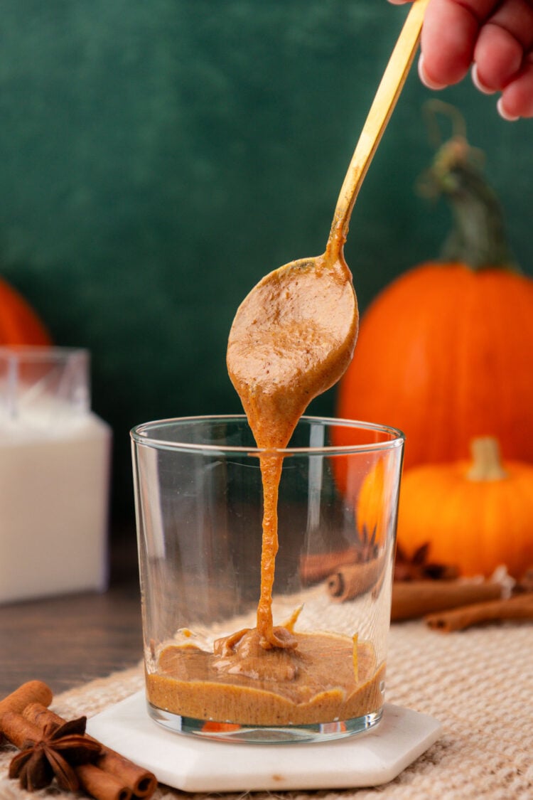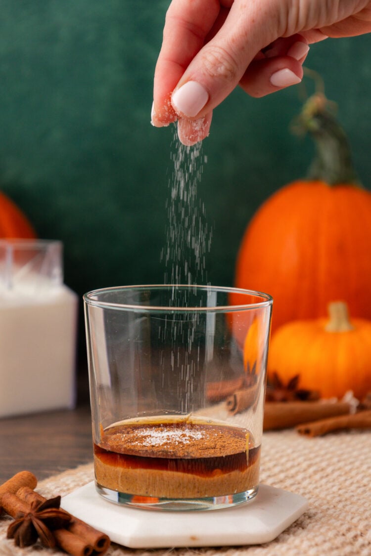 - Add 3 tablespoons pumpkin spice sauce, 1 tablespoon maple syrup, ⅛ teaspoon pumpkin pie spice, and 1 pinch salt to a glass and stir to combine.