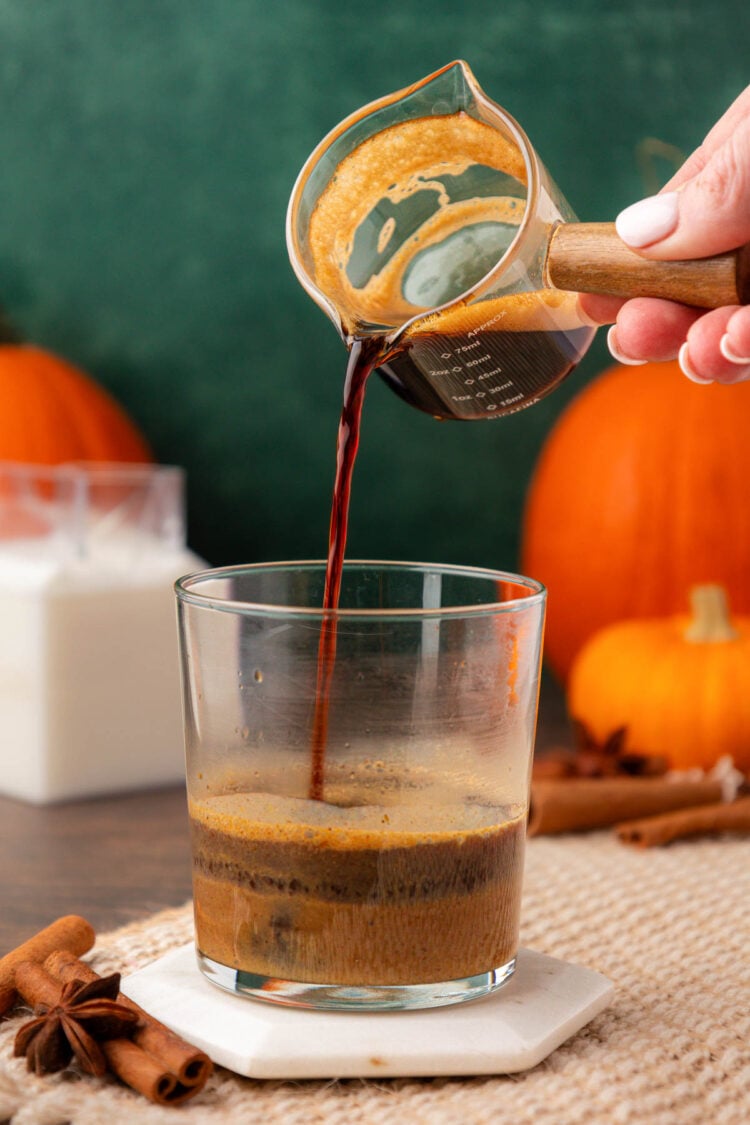 - Brew 2 ounces espresso over the pumpkin mixture and stir with a spoon or mix with a hand frother until the dry spice is thoroughly combined.