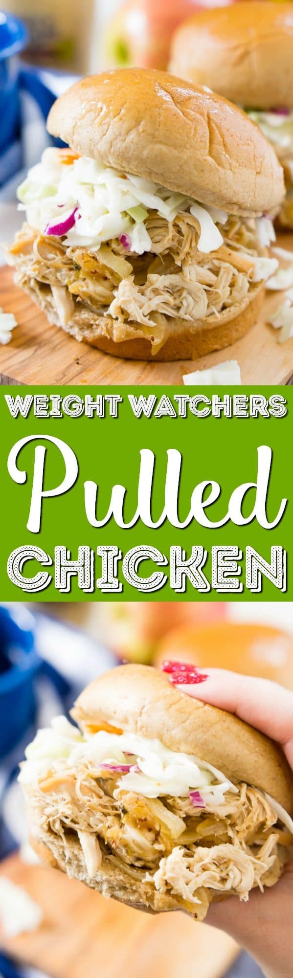 This Apple Cider Pulled Chicken is Weight Watchers approved and so easy to make! You can turn it into sandwiches, tacos, sliders, or serve it over rice!