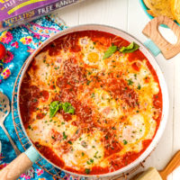 You can crack your eggs directly into the sauce, but it's much easier to crack them into a small prep bowl one at a time and add them that way. To add the eggs, use a mixing spoon to pull back some of the sauce to create a well, and slowly pour the egg in. Repeat until all the eggs have been added.